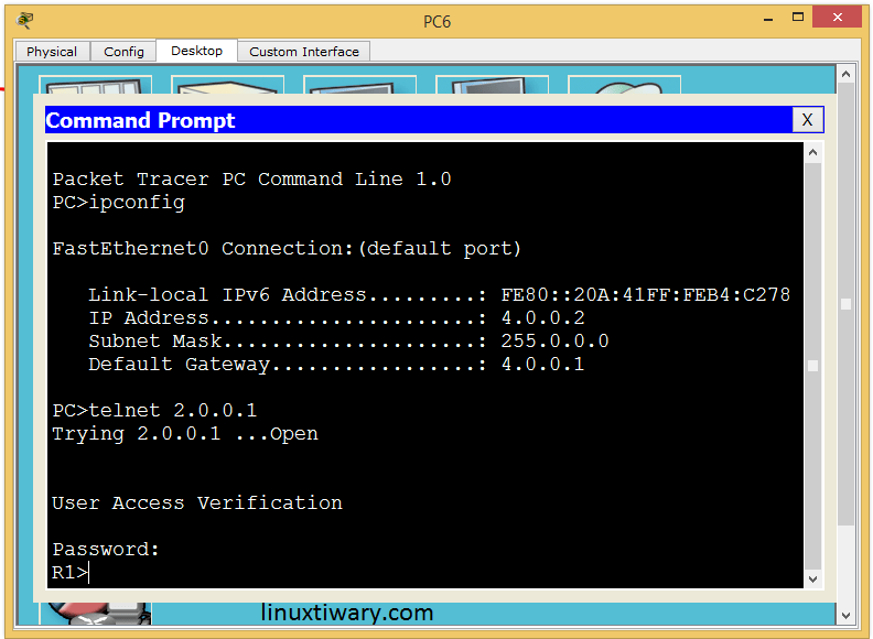 Now you can also see PC from network 5.0.0.0/8 are not able to do telnet on Router R1 because this network has been blocked from doing telnet on R1.